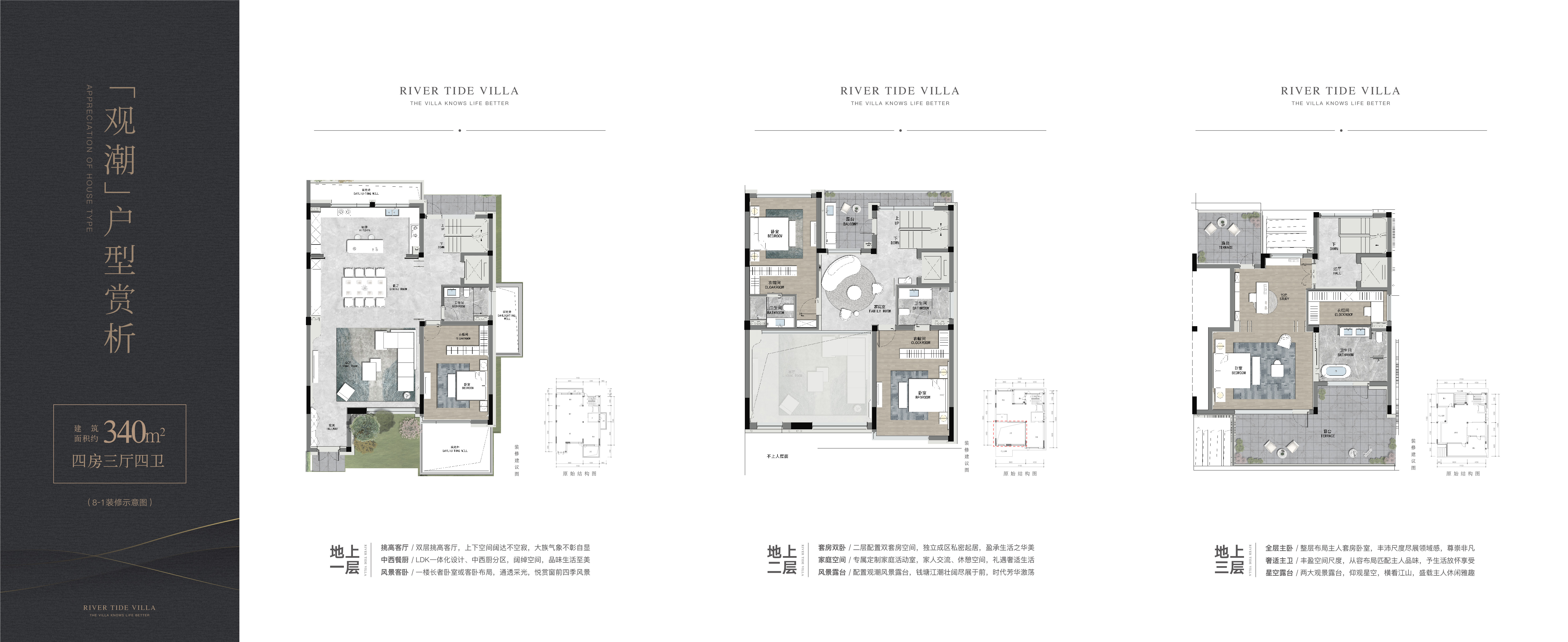 户型多样:建面约 300 - 870㎡三层户型,庭院 80 - 300㎡,最大近 2 亩。