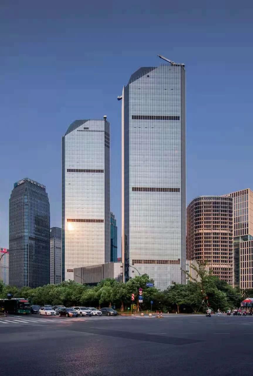 项目北侧钱江路,南侧富春路,西侧解放东路,东侧庆春东路;东塔楼8至44层,共有693套精装平层,其中506套为小户型公寓,层高3.55米,共44层;底区 8至19层,每层24户,21至40层,每层20户共12部电梯。