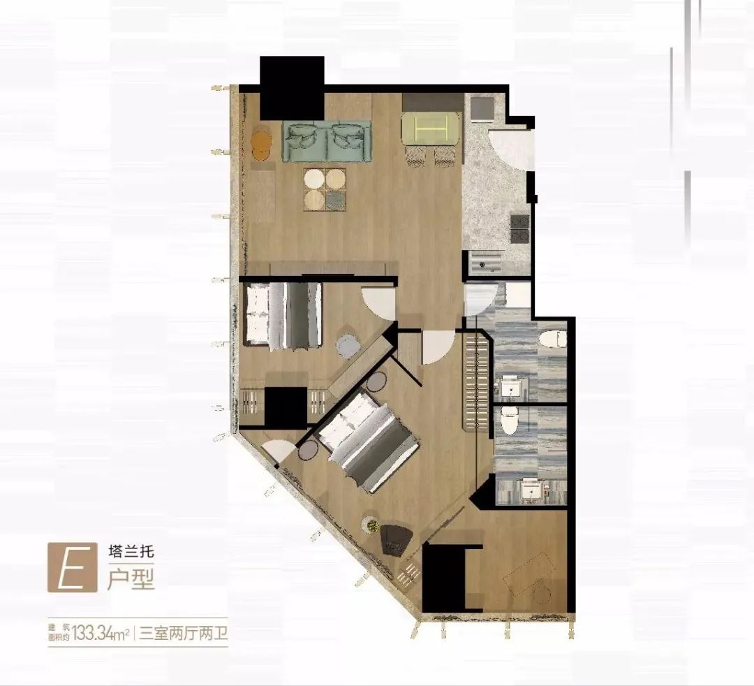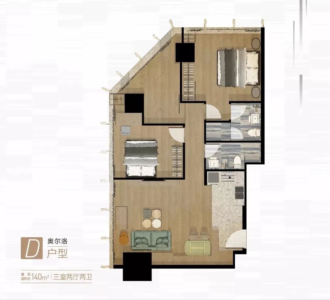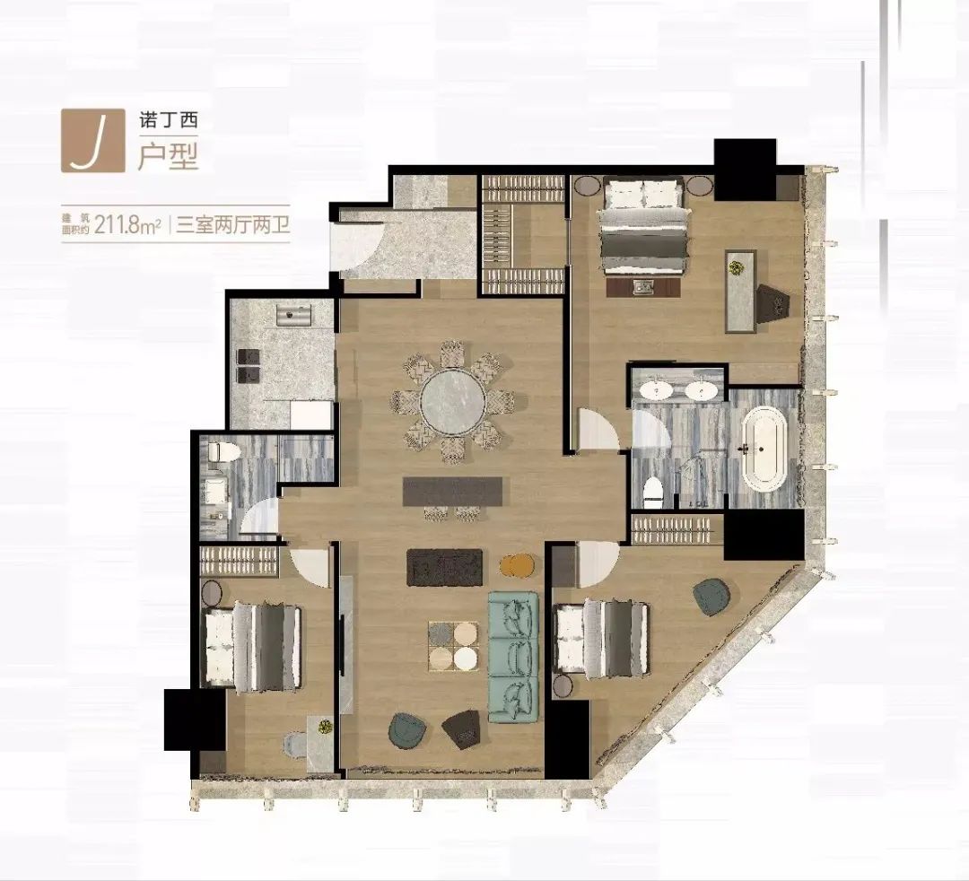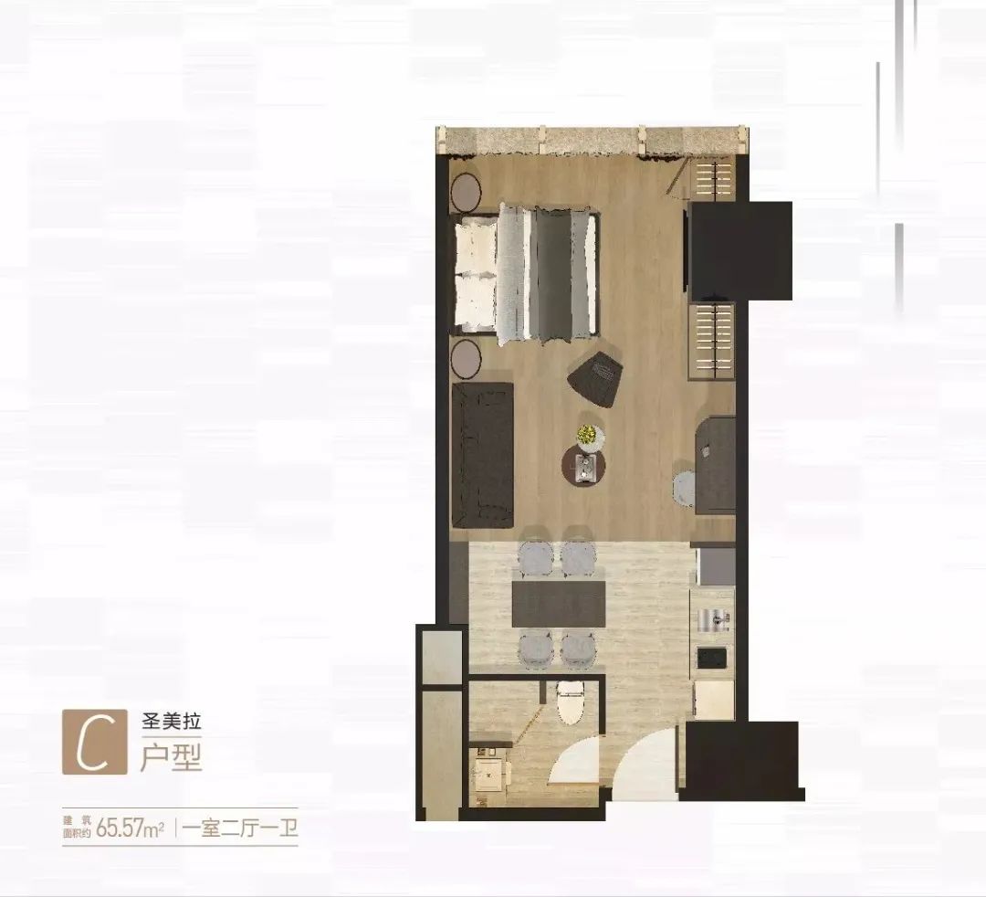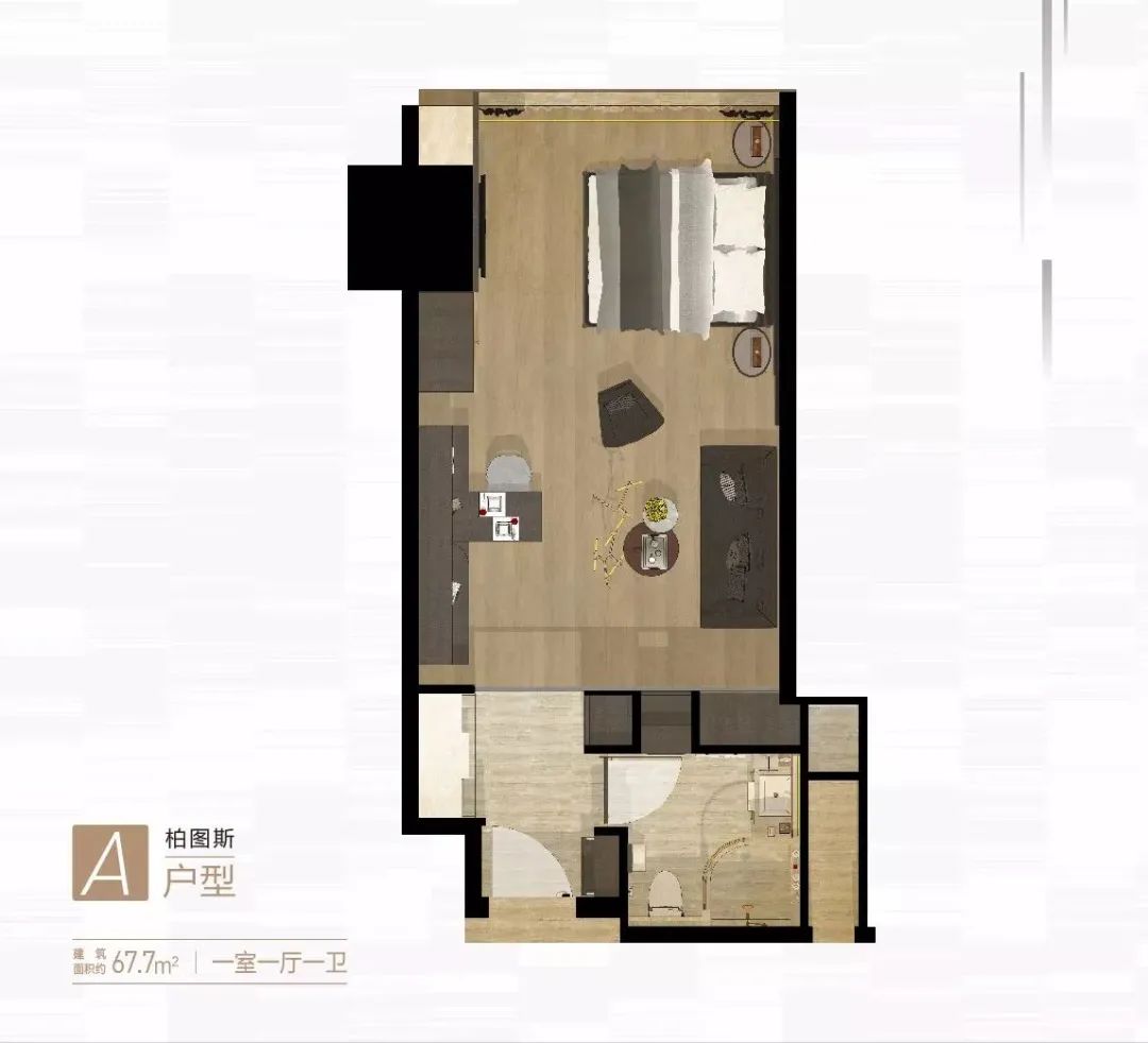 65方和67方为主力户型,一室一厅一卫,开间4.5米,层高3.55米,211.8方为三室两厅两卫。